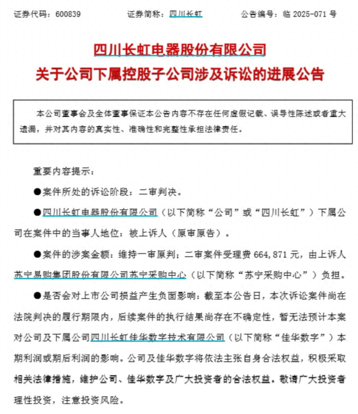9月11日,四川长虹电器股份有限公司(以下简称“四川长虹”)发布关于公司下属控股子公司涉及诉讼的进展公告。公告显示配资365,该案件已进入二审判决阶段,四川长虹下属公司作为被上诉人(原审原告),二审判决维持一审原判,二审案件受理费664,871元由上诉人苏宁易购集团股份有限公司苏宁采购中心负担。