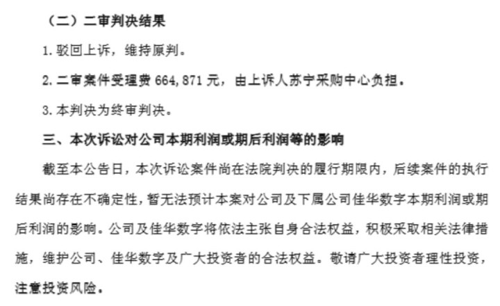 2025年5月26日,佳华数字收到南京中院送达的关于上述案件的《民事判决书》,法院判决苏宁采购中心需向佳华数字支付货款本金超7.2亿元,以及截至2024年9月13日的资金占用损失超1.24亿元,后续利息按同期LPR的1.3倍算至实际清偿日。同时,佳华数字对包头苏宁、大庆苏宁等提供的抵押物有优先受偿权。