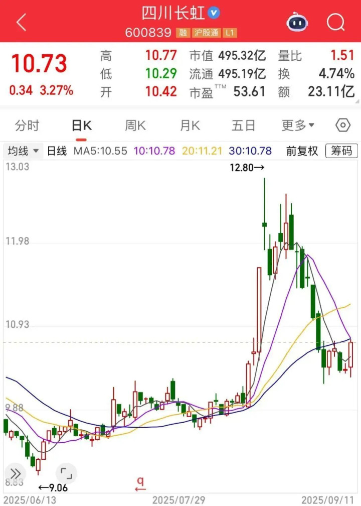 截至9月11日收盘,四川长虹上涨3.27%,报10.73元/股,总市值495.32亿元。